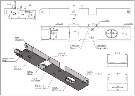 | 可生产的板型规格及冲孔 | 冲孔模具包含: 1.腰高切除模具; 2.腹板螺栓连接孔13*17; 3.过管翻边孔165; 4.腹板卡扣; 5.联接钉窝孔M4.8; 6.过线孔40*80; 7.三联孔; 8.对穿孔(全尺寸范围共七套,详见板型图); 9.切小边; 10.切角(全尺寸范围共七套,详见板型图); 11.线上缩口; 12.线上扩口冲模(规格150以上); 13.线下端部翻边模具;